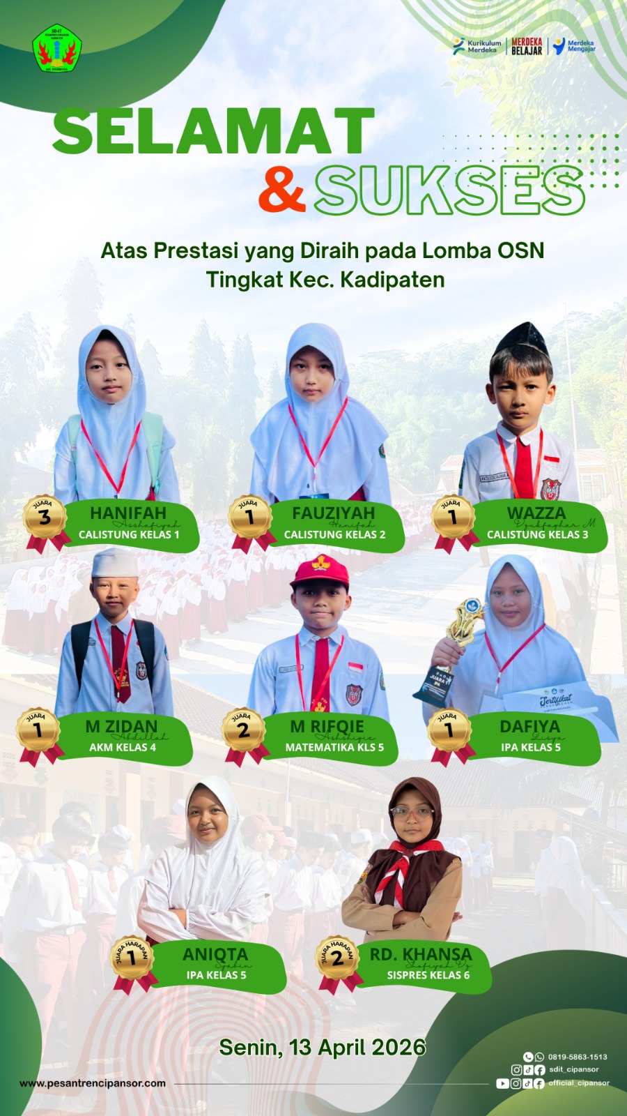 Berikut daftar lengkap prestasi yang diraih oleh siswa-siswi SD IT Pesantren Cipansor dalam ajang OSN Tingkat Kecamatan Kadipaten Tahun 2026: